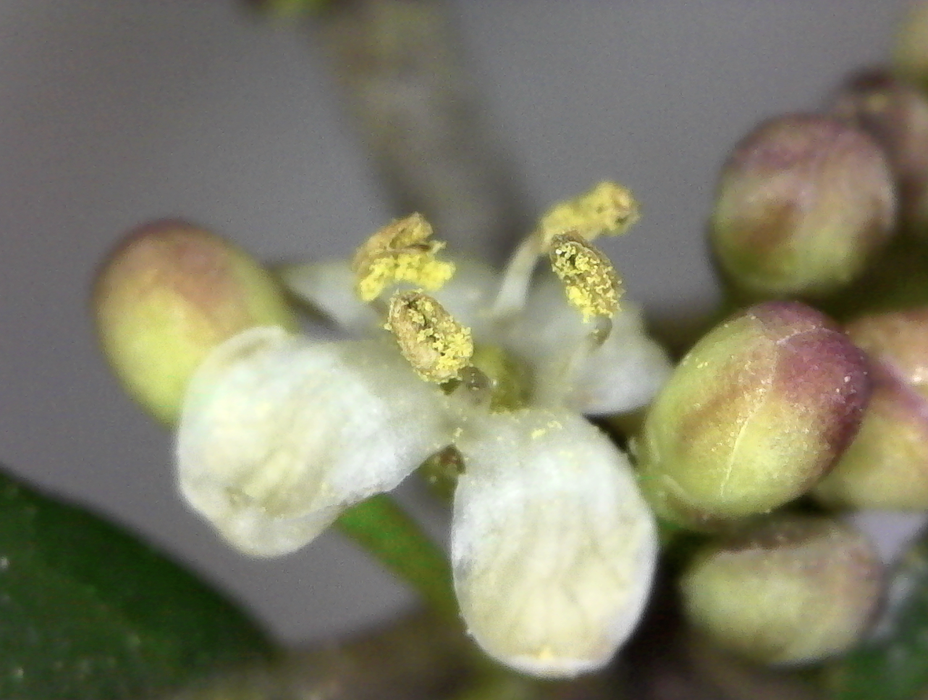 Pictured above is a staminate yaupon holly flower. Two of four anthers, covered in pollen, can be clearly seen in the foreground. Galle notes that pistils are present in staminate holly flowers, but are rudimentary and non-functional.