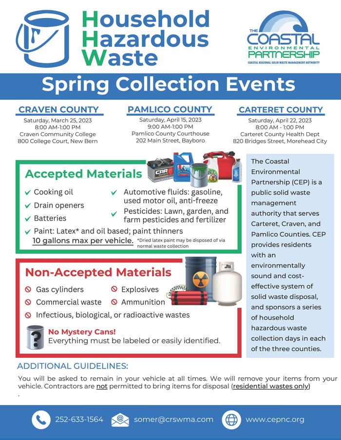 Upcoming Spring Household Hazardous Waste Collection Days for Craven, Carteret, and Pamlico counties.